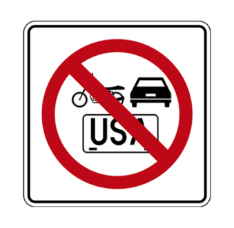 Se usa para indicar la prohibición de circulación de vehículos matriculados en otro país que no cuenten con el permiso de internación al territorio nacional expedido por la autoridad correspondiente.